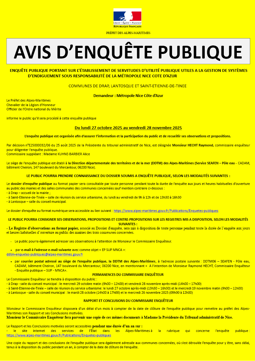 Consultez l’arrêté préfectoral n°2025-220 du 09/10/2025 portant ouverture de l’enquête publique relative à l’instauration des SUP en cliquant ci-dessous :