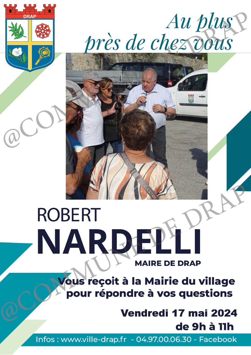 Robert Nardelli a décidé de rencontrer les Drapois au plus près de chez eux, grâce à des permanences en Mairie Annexe et en Mairie principale, sans rendez-vous.La prochaine permanence aura lieu le vendredi 5 avril, de 9 à 11 heures à la Mairie annexe de La Condamine.
