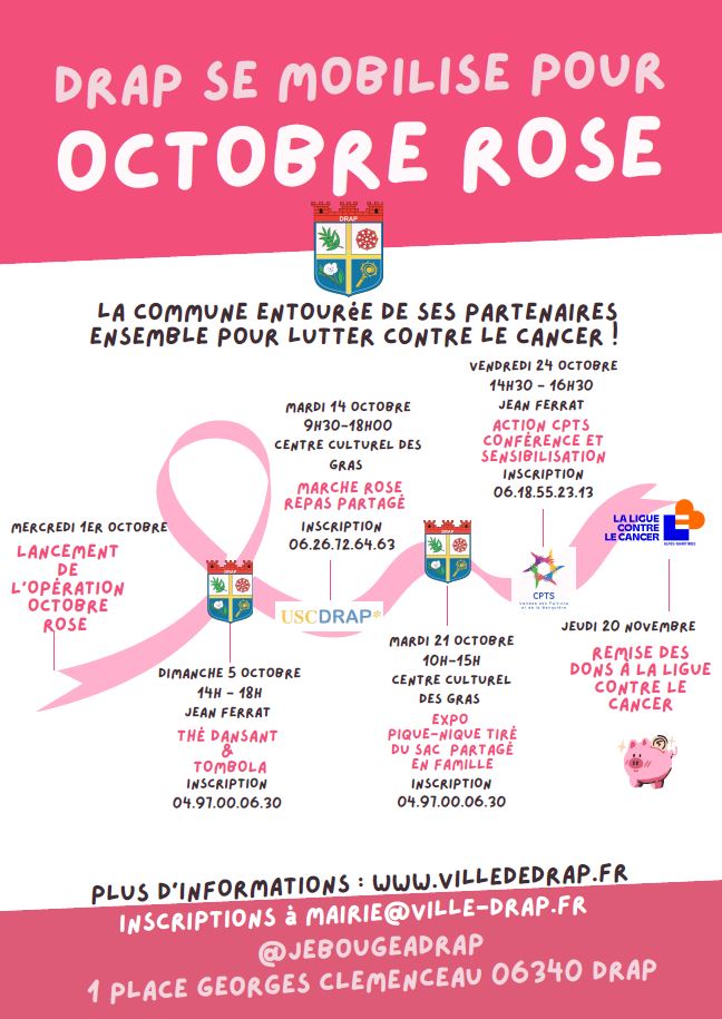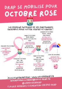 En faveur de l’association « La ligue contre le cancer », il s’étend sur tout le mois, au travers d’événements organisé par la Commune de Drap et ses partenaires.